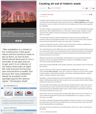 The installation piece at the Apartheid Museum has been featured in the Engineering News magazine. The installation, titled Twenty Years Ago is made from the original Robben Island Fencing and serves to remind us that 2010 is not just about the World Cup but is also the 20th anniversary of the release of Nelson Mandela.